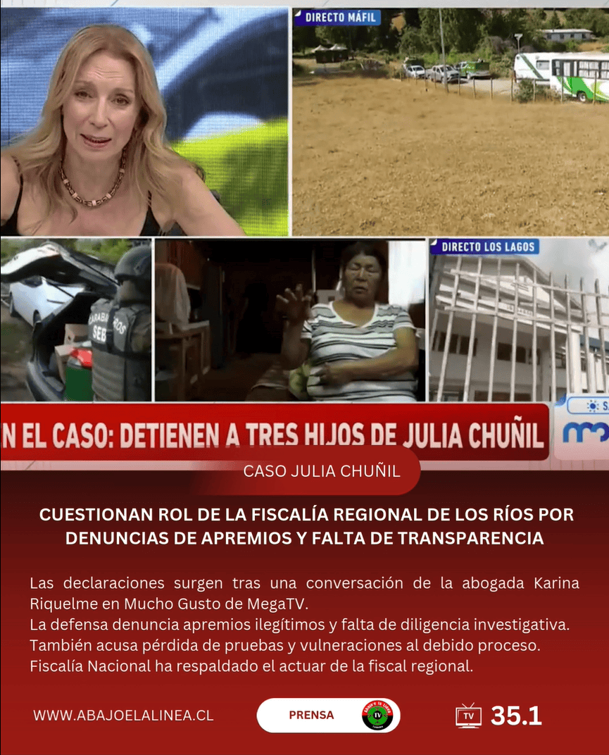 En conversación con medios, la abogada de la familia, Karina Riquelme, afirmó que la fiscal regional “nunca recibió a la familia” y que actualmente “es quien dirige una persecución penal contra personas que previamente la denunciaron por un delito grave como es el apremio ilegítimo”. Riquelme sostuvo además que la Fiscalía no desarrolló oportunamente líneas de investigación apuntadas por la familia, como la revisión de cámaras de seguridad de una forestal colindante al lugar donde Julia Chuñil fue vista por última vez.